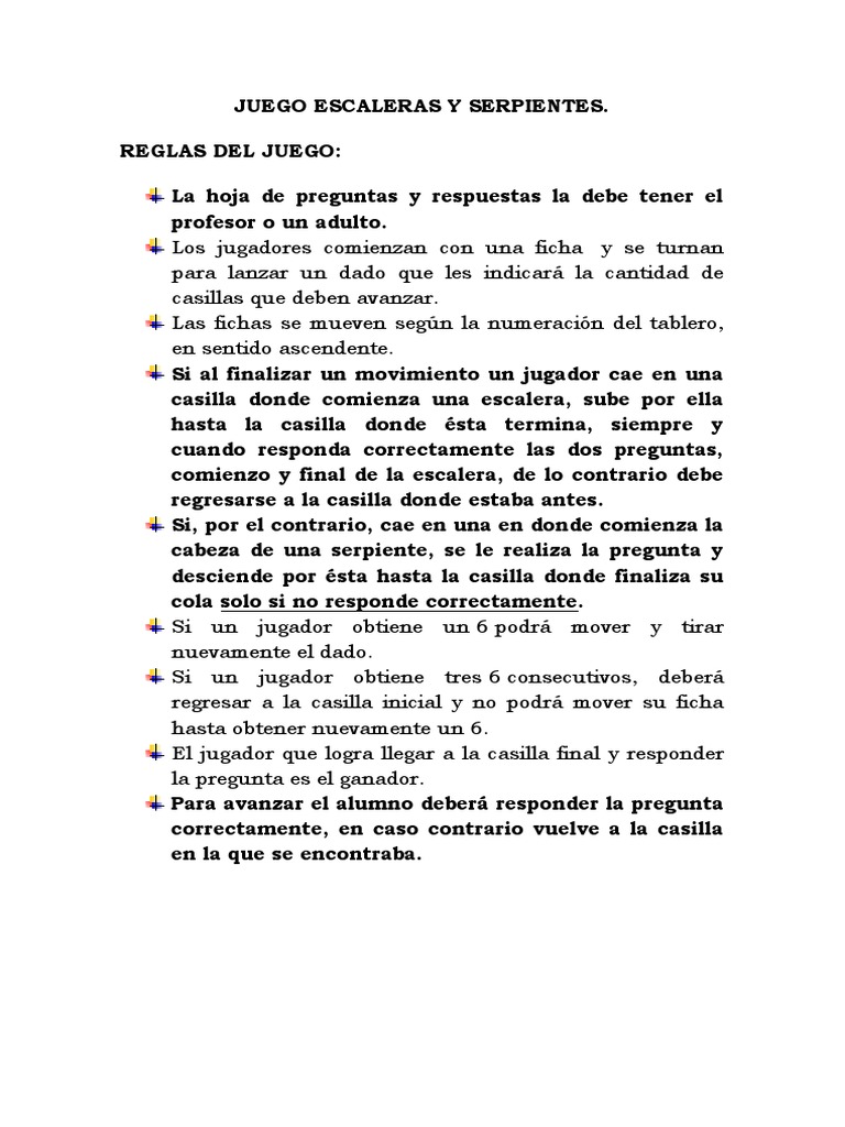 Los jugadores hablarán todo el tiempo el idioma minoritario. Se juega entre dos o más personas en un tablero numerado y dividido en casilleros. Juego de mesa tradicional de serpientes escaleras, que consiste en tirar el dado de forma aleatoria y avanzar con tu ficha. Como en el famoso juego de las serpientes y escaleras, que hunde sus raíces en la filosofía hindú, la sociedad podría ser ese tablero por el que se asciende. Serpientes y escaleras tiene unas reglas de juego muy simples, que lo hacen un juego de serpientes fácil, entretenido y divertido, ideal para toda la familia.